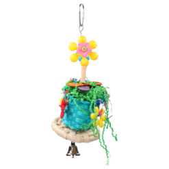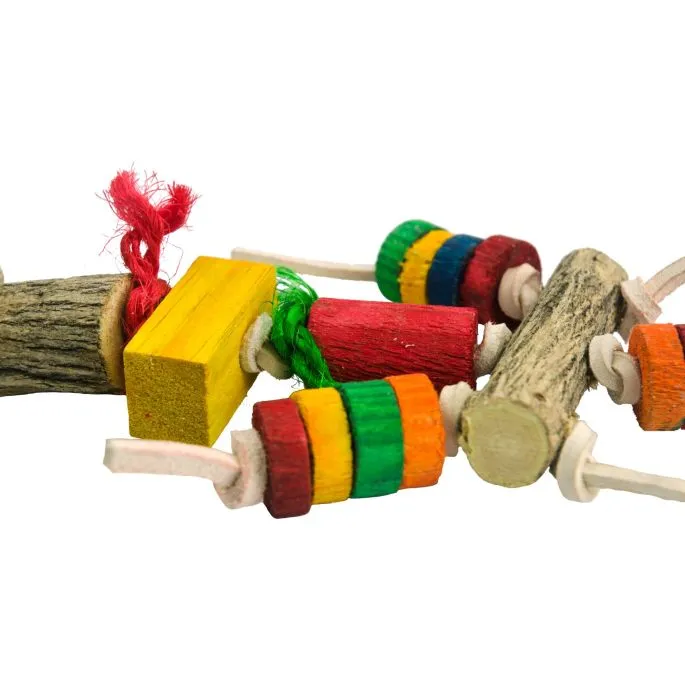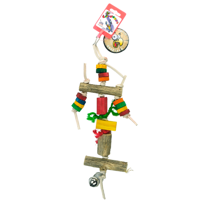 Vrolijk de kooi van uw vogel op met dit kleurrijke vogelspeeltje. Dit speeltje bestaat uit Sekelbos (hout) met vrolijk gekleurde blokjes en touw. Gemakkelijk aan de kooi te bevestigen d.m.v. het karabijnhaakje.