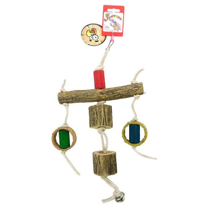 Klim- speeltouw inclusief coral/zandstructuur cilinders! De coral/zandstructuur cilinders dragen bij aan het onderhoud van de pootjes en snavel van uw vogel. Dit speeltje bevat Sekelbos (hout), cilinders met coral/zandstructuur, T-Pillar lederen touw en een leuke bel aan de onderzijde voor extra speelplezier. Het speeltje is makkelijk te bevestigen d.m.v. het karabijnhaakje.
