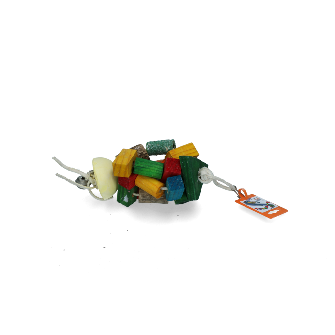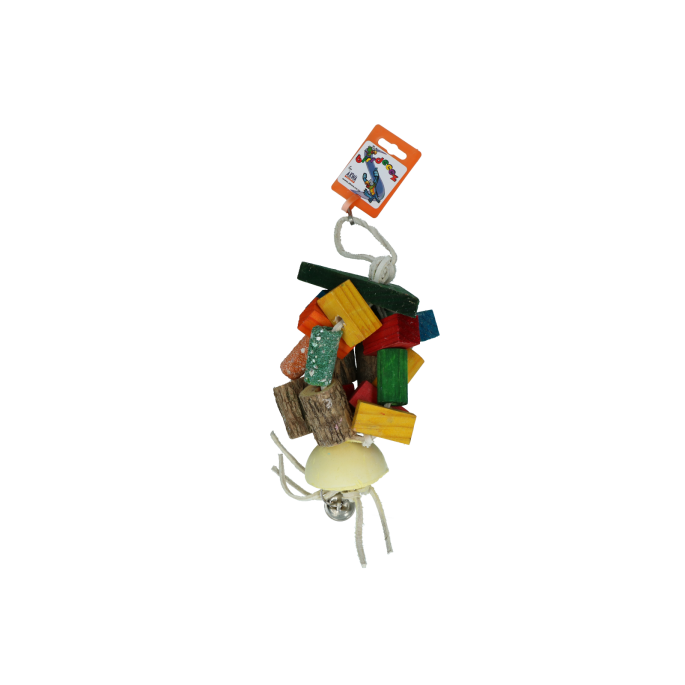 Dit vrolijk gekleurde speeltje van diverse stukjes hout is voorzien van leren touwtjes en een belletje. Voor urenlang speelplezier.Â