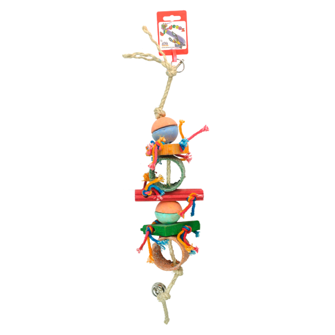 Groot klim- speeltouw inclusief mineraal bal en coral/zandstructuur cilinder! De coral/zandstructuur cilinder draagt bij aan het onderhoud van de pootjes en snavel van uw vogel. Dit speeltje is makkelijk te monteren met behulp van een klein karabijnhaakje. Bevat mineraalballen, cilinders met zandstructuur, touw en een leuke bel aan de onderzijde voor extra speelplezier.