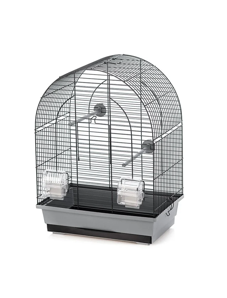 Grijs-zwarte vogelkooi met accessoires