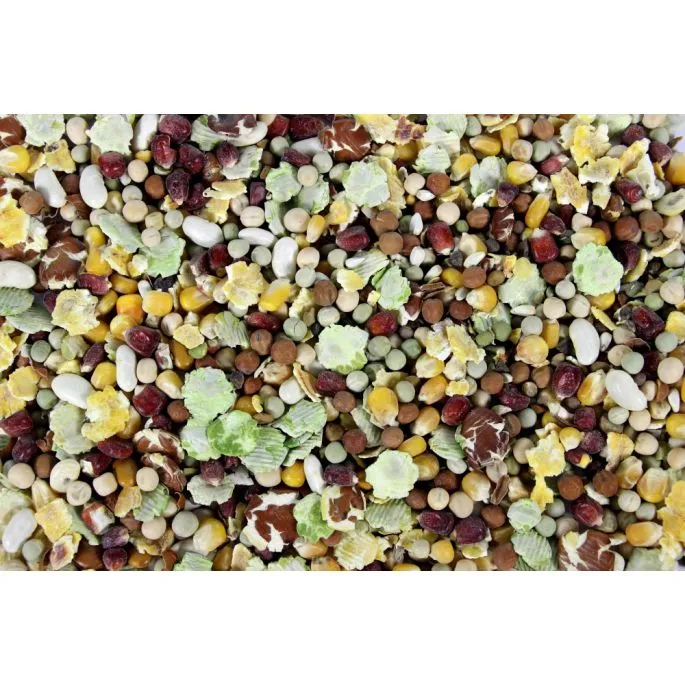 Rode en gele mais. dunpeas. gele en groene erwten erwten- en maïsvlokken. witte bonen. linzen. bruine bonen. bonenvlokken. duivenbonen. Katjang Idjoe. Bevat geen kunstmatige toevoegingen.