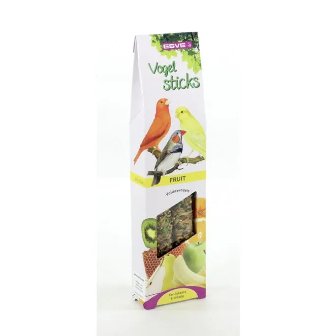 ESVE sticks zijn smaakvolle voedings- en traktatie stangen, boordevol belangrijke voedingsstoffen, geheel afgestemd op de behoefte van uw vogel(s). Bij de samenstelling is o.a. gebruik gemaakt van de zaden en grondstoffen die de vogel ook in de vrije natuur tot zich neemt, aangevuld met de noodzakelijke vitamines, die de weerstand verhogen en bijdragen aan een gezonde vogel met een mooie vederpracht.