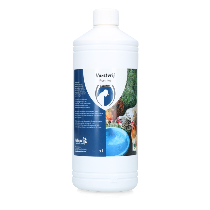 Vorstvrij voor kippen is een voedermiddel voor kippen voor een aanvulling van energie tijdens koude periodes. Vorstvrij helpt het drinkwater van kippen vorstvrij te houden, door het vriespunt van het water te verlagen. Dit voedermiddel bevat glycerine en is gemakkelijk te gebruiken. Los 1 deel Vorstvrij op in 4 delen drinkwater. Voor ÊÊn liter drinkwater gebruikt u dus 200 ml Vorstvrij en 800 ml water. Vorstvrij is te gebruiken voor een periode tot 14 achtereenvolgende dagen en biedt de mogelijkheid tot vers drinkwater tot -9 â.Â