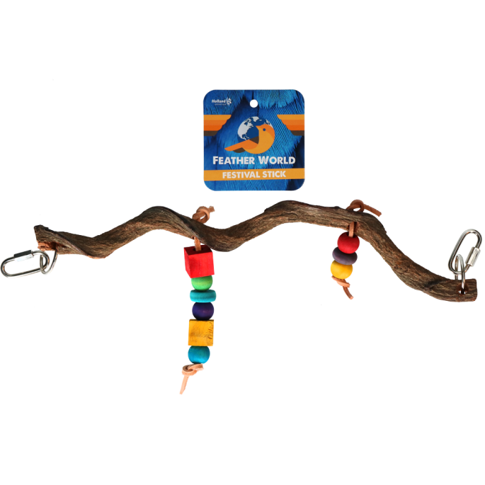 Aan de stok zelf zijn leuke materialen bevestigd, zoals houten en leren deeltjes.Â